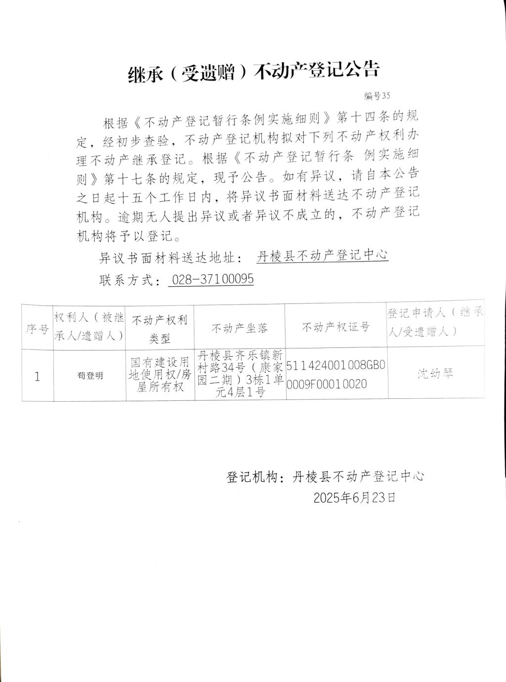 继承(受遗赠)不动产登记公告(沈幼琴)