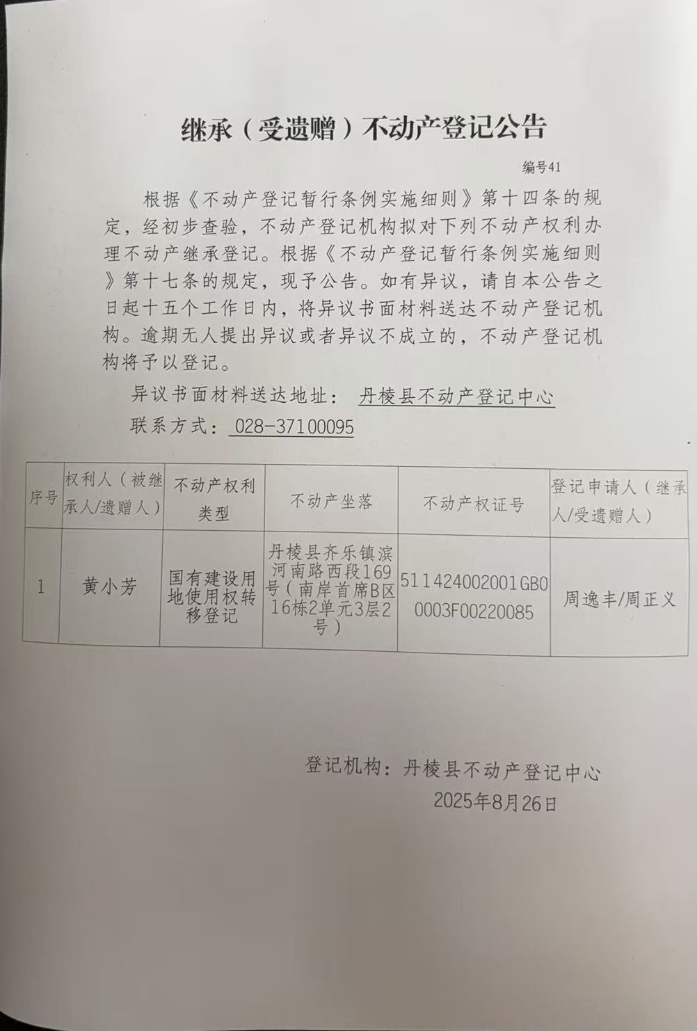 继承(受遗赠)不动产登记公告(周逸丰、周正义)41号