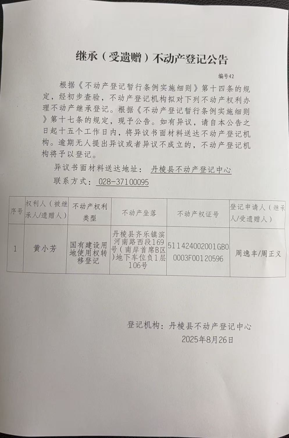 继承(受遗赠)不动产登记公告(周逸丰、周正义)42号
