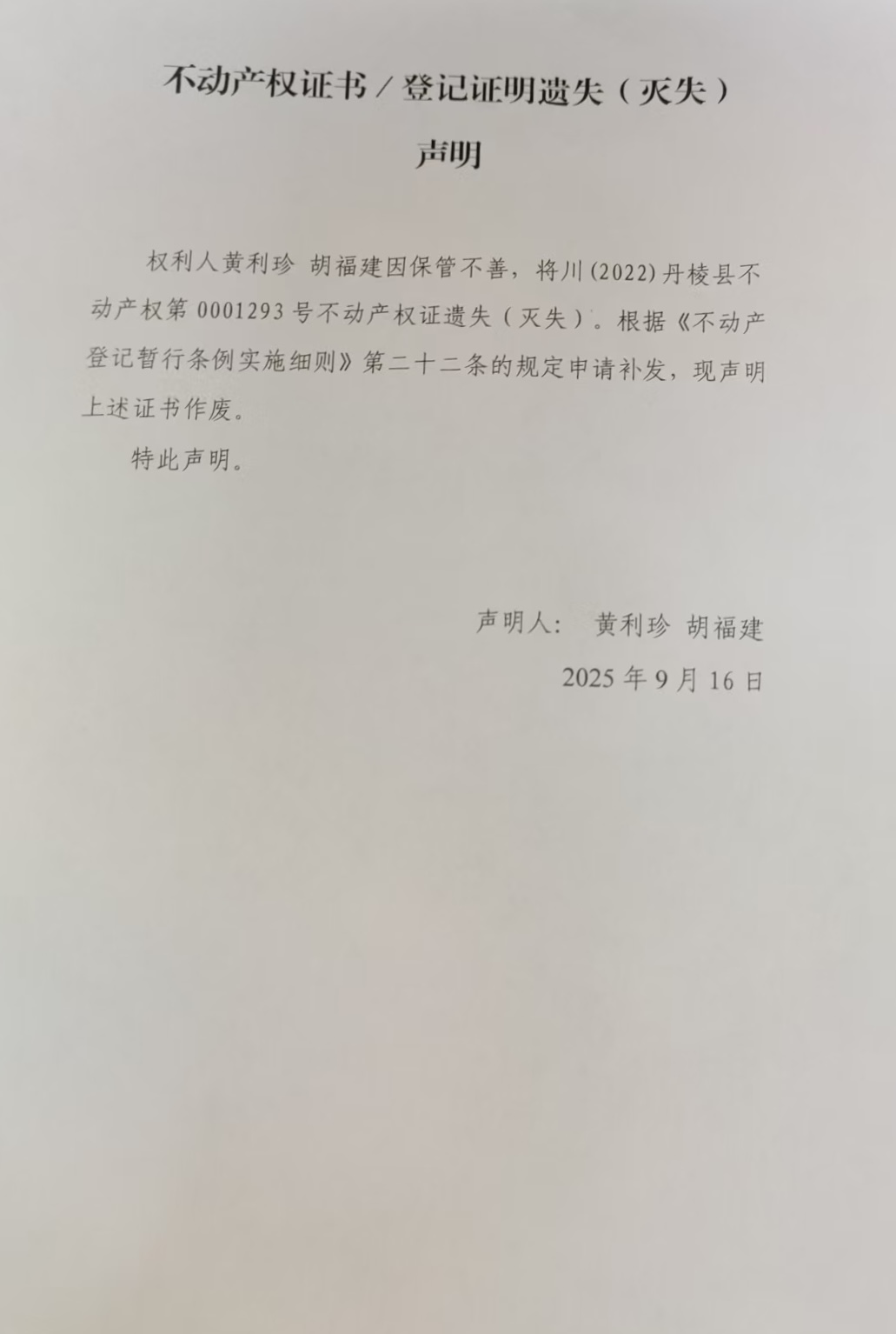 不动产权证书/登记证明遗失(灭失)声明(黄利珍 胡福建)