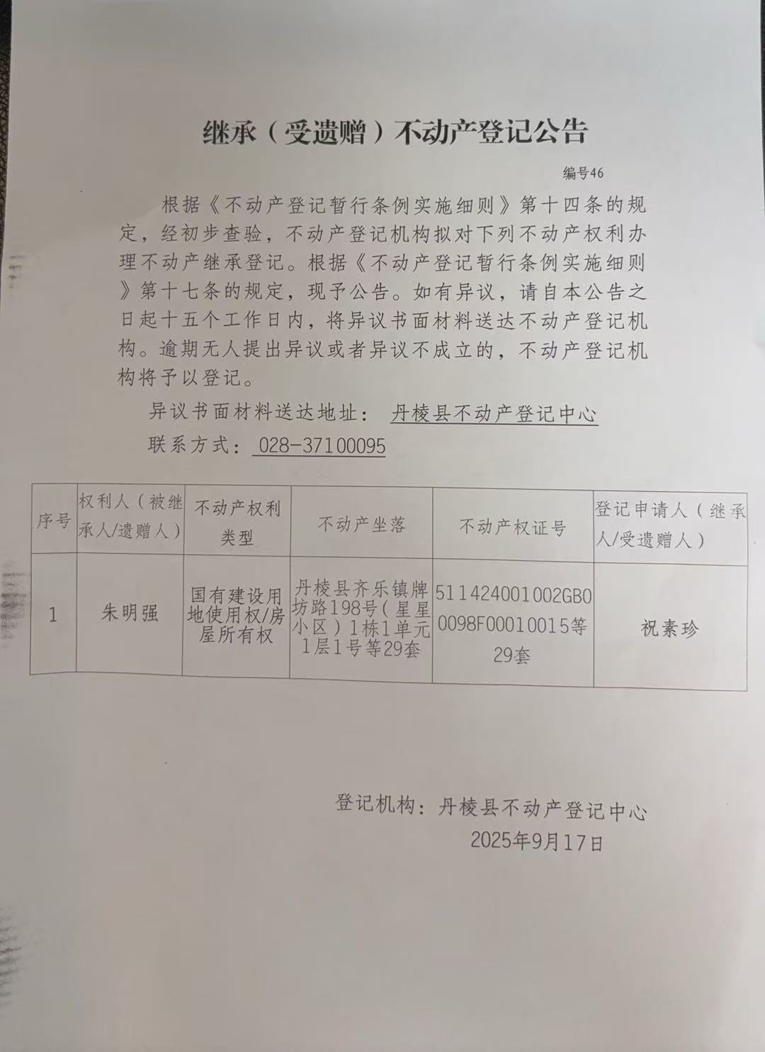 继承(受继承)不动产登记公告(祝素珍)46号