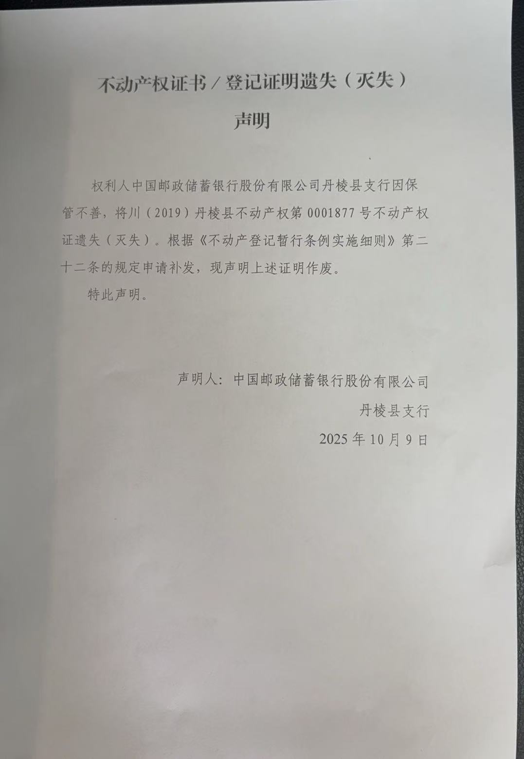 中国邮政储蓄银行股份有限公司丹棱支行不动产权登记证书遗失声明