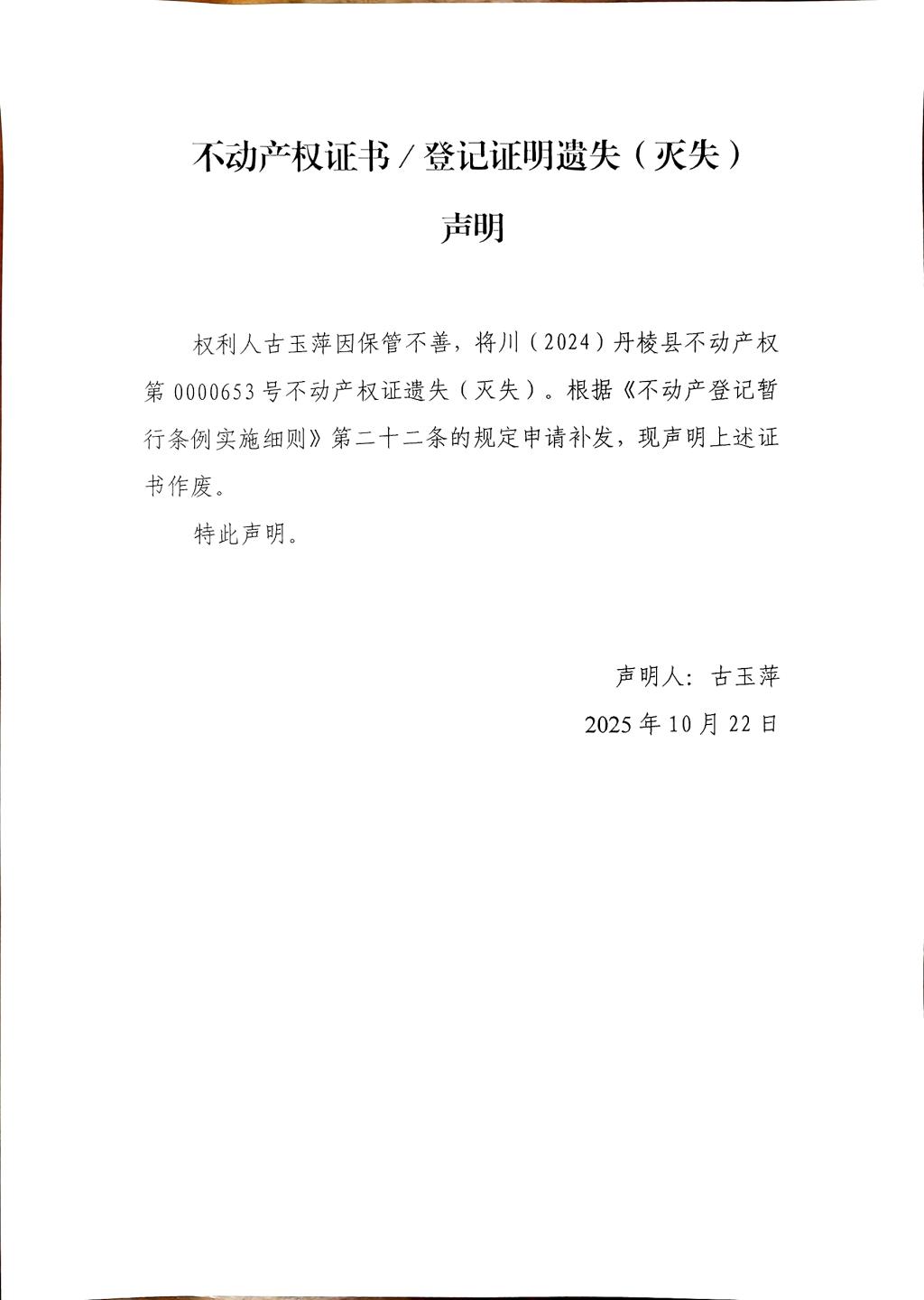 不动产权证书/登记证明遗失(灭失)声明(古玉萍)