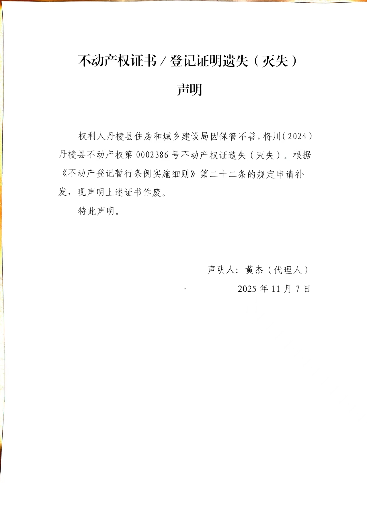 不动产权证书/登记证明遗失(灭失)声明(丹棱县住房和城乡建设局)