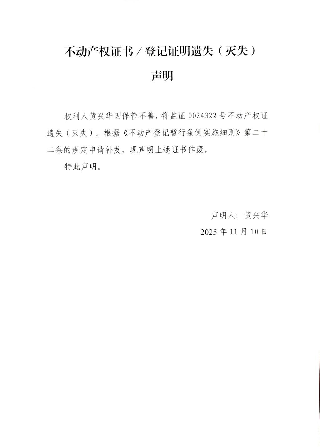不动产权证书/登记证明遗失(灭失)声明(黄兴华)