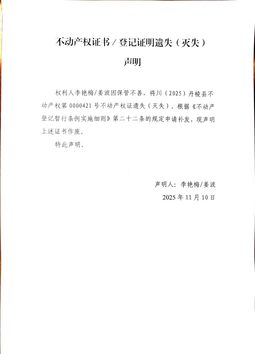不动产权证书/登记证明遗失(灭失)声明(李艳梅/姜波)