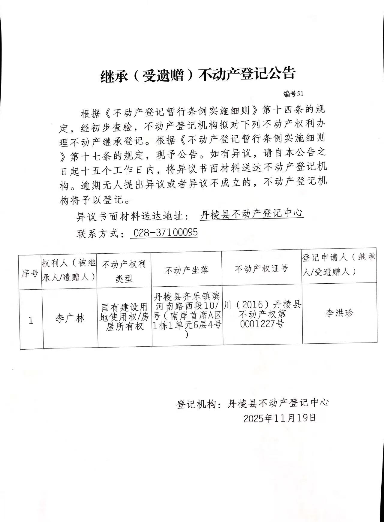 继承(受遗赠)不动产登记公告(李洪珍)