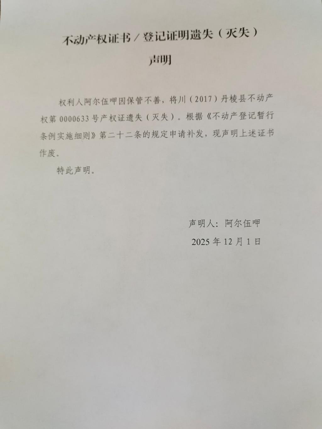 不动产权证书/登记证明遗失(灭失)声明(阿尔伍呷)