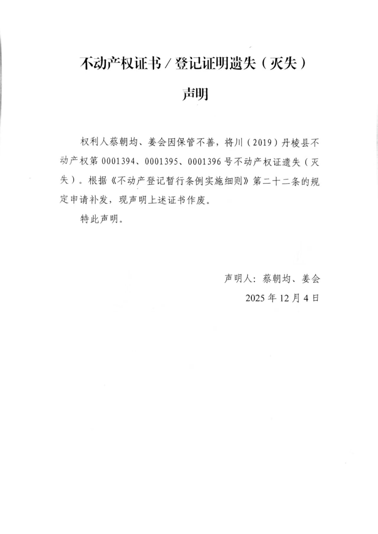 不动产权证书/登记证明遗失(灭失)声明(蔡朝均、姜会)