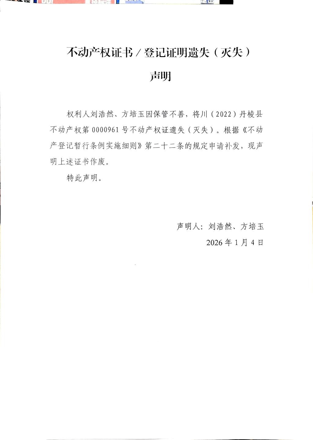不动产权证书/登记证明遗失(灭失)声明(刘浩然、方培玉)