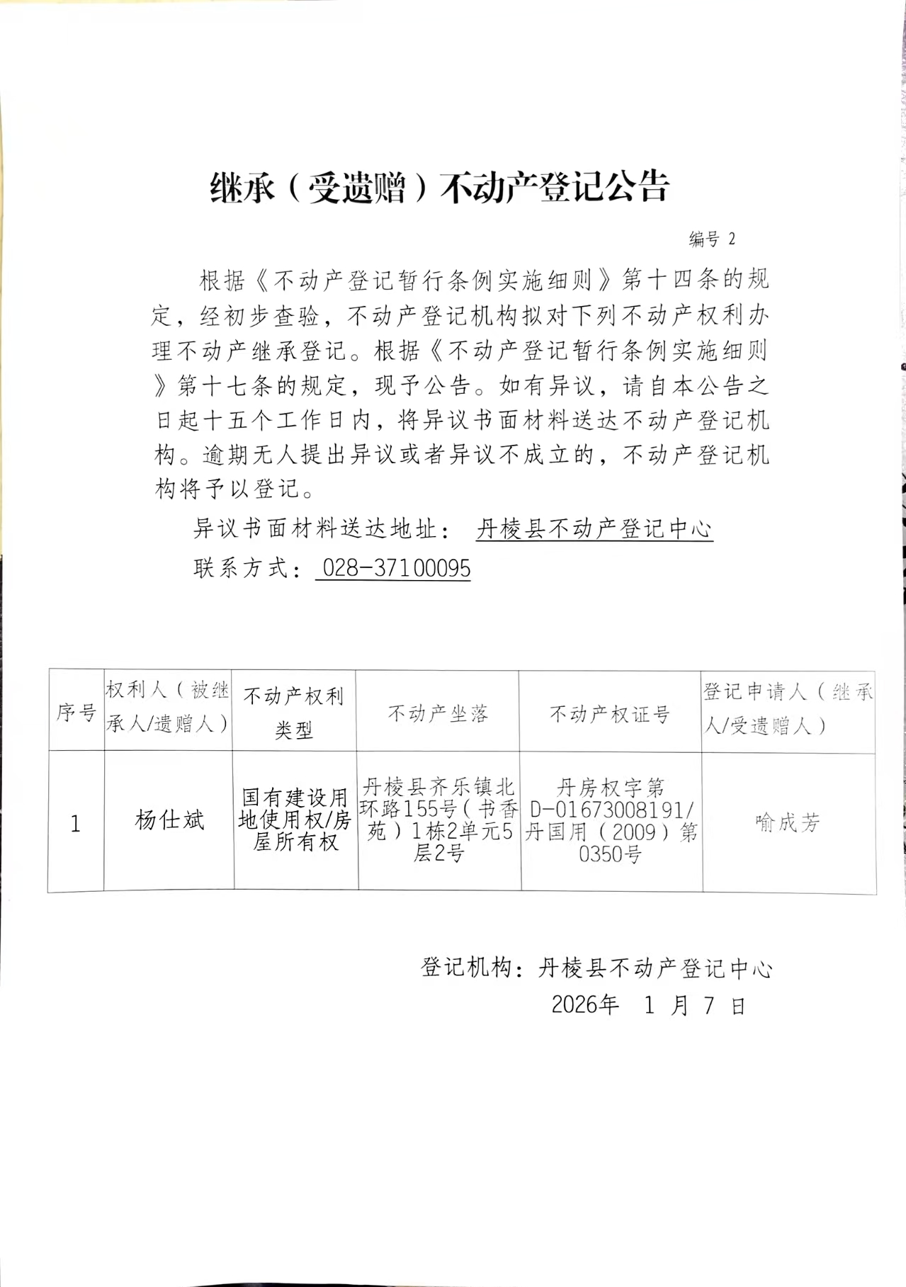 继承(受遗赠)不动产登记公告(喻成芳)