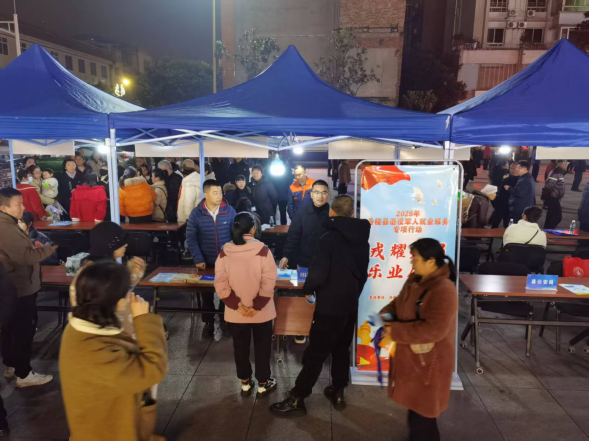 近日,丹棱县唢呐广场的夜市中格外热闹,由县退役军人事务局联合县人社局共同主办的“戎耀归蜀 乐业眉州”退役军人及家属专属招聘会在此开市。主办方创新利用夜市人流集中优势,将“消费场”变身“纳贤场”,让退役军人及家属在休闲氛围中实现精准求职。